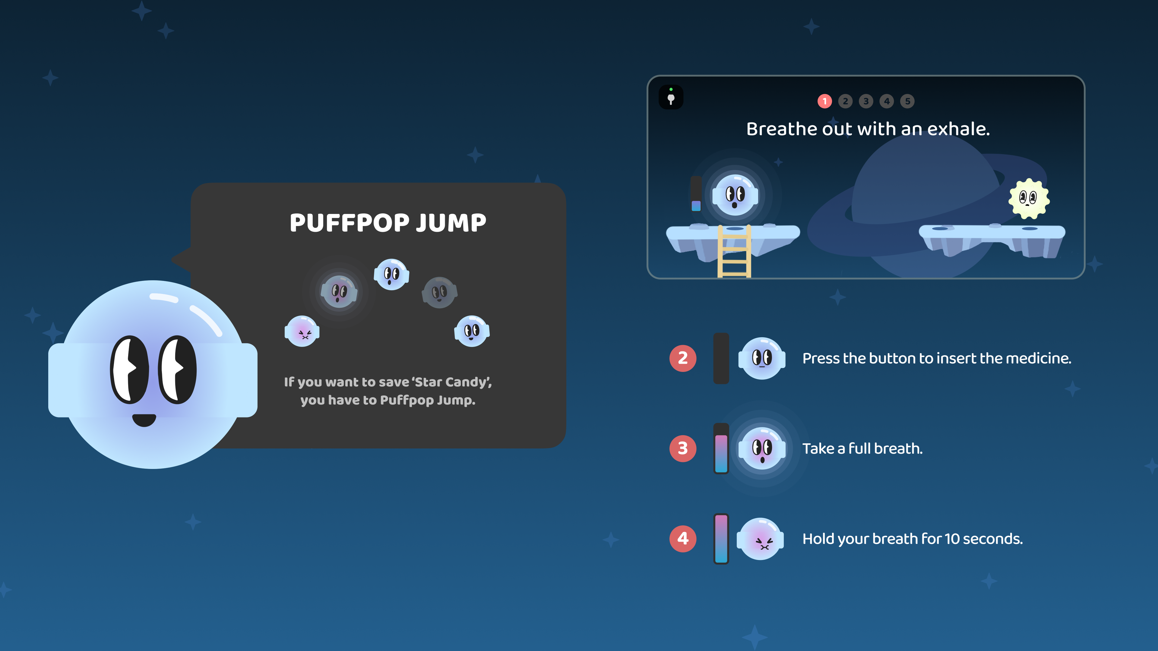 ‹퍼프팝(Puffpop)›은 아이들이 게임을 하며 자연스럽게 천식을 자가 관리하는 법을 습득하도록 설계되었다. 스마트 흡입기를 연동하여 단계별로 적절한 압력과 지속력을 통한 들숨과 날숨의 과정에 대해 배우고, 흡입기를 정확하게 사용할 수 있는 방법을 습득한다.